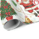 Dieses bezaubernde Weihnachtspapier zeichnet sich durch ein sich wiederholendes Muster klassischer Urlaubsmotive auf einem hellen Hintergrund aus. Das Design umfasst fröhliche Weihnachtsklauseln mit ausgestreckten Armen, verzierte Weihnachtsbäume in Töpfen, festliche grüne Kränze, verstreute Geschenke, heilige Zierpflanzen und verwinkelte Ziergegenstände. Die Wörter "Frohe Weihnachten" werden in einem Script-Schriftart geschrieben, das sich durch das Muster zieht und die traditionelle und fröhliche Urlaubssästhetik ergänzt.