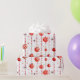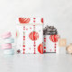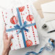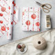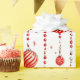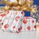 Dieses Verpackungspapier weist ein sich wiederholendes Muster von Weihnachtsschmuck in Rot und Weiß auf, das von vertikalen Fäden roter Perlen hängt. Kleine rote Sterne, die im weißen Hintergrund verstreut sind. Einige Ornamente sind solide rot, andere sind rot-weiße Streifen.
