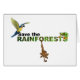 Rett die Regenwälder in einer farbenfrohen Grafik mit einem Ara, einem Baumfrosch und einem ihn umgebenden Affen.