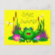 Rett die Postkarte des Sümpfels, Beulah der Frosch (eine wahre Femme Fatale der Froschwelt) mit rosa Lilien, Libellen, Fesseln und Moorblättern, fröhlich gelbem Hintergrund. Die Feuchtgebiete sind reich an vielfältigen Tierarten und farbenfroher Flora und stellen eine lebenswichtige Quelle natürlicher Ressourcen dar. Ein Teil der Erlöse aus jedem "Rett den Sumpf!" Das verkaufte Produkt geht in Umweltbewusstsein und Naturschutz für Feuchtgebiete. Rett den Sumpf und teile die Freude!