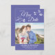 Eleganter und romantischer Rett The New Date - Hochzeitsfotokarte, mit einer wunderschönen und zarten Blumenlinie, die auf einem lila Hintergrund mit einem klassischen Perwinkl gezeichnet wird. Einfach personalisierbar, indem Sie eine Ihrer Lieblings-Verlobung-Horizontalbilder hinzufügen und die Vorlagenfelder im lila Unterband mit Ihren Namen, Datum und Position in einem modernen, schlichten Schriftart mit weißem Allcap bearbeiten. Für weitere Personalisierungen oder Sonderanfertigungen, kontaktieren Sie mich bitte unter acherryonthecake@hotmail.com (bitte 1-2 Arbeitstage). Diese Save the Date Karte ist Teil der Kollektion "Delikate Orchideen - Periwinkle Lila Hochzeitssuite" mit vielen koordinierenden Gegenständen, um eine einzigartige Hochzeitssuite zu schaffen.