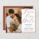 Elegante Ankündigung Datum freihalten ist perfekt, um Ihre Hochzeitspläne in Gang zu bringen. Es verfügt über eine Fotovorlage und große "Save the Date" Typografie in Terrakotta auf einem weißen Hintergrund. Passen Sie Ihre persönlichen Daten an.