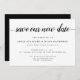 Einfach und elegant speichern Sie die Datumskarten informieren Sie Ihre Gäste über Ihren neu geplanten oder aufgeschobenen Hochzeitstag. Knackige weiße Karten haben "rett unser neues Datum" in der Schrift Kalligrafie, mit Ihren Namen, neuen Hochzeitstermin und Position unten in klassischen schwarzen Serif-Typ. Fügen Sie zusätzliche Informationen, wie Ihre Hochzeitswebsite, auf der Rückseite in weißer Schrift auf einem kontrastierenden schwarzen Hintergrund.