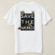 Das vordere Kastenlogo des Shirts liest… "RETTEN DIE BIENE". Das hintere Kastenlogo des Shirts liest "RETTEN DIE WELT"