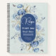 Modernes elegantes, rosa und blaues Rezept-Notebook. Dieses atemberaubende Notebook ist mit einem blauen Rahmen und blühenden blauen Aquarellblüten mit Schmetterlingen auf staubblauem grünem Splash-Hintergrund ausgestattet. Sie können einfach Ihren Namen und Ihr Datum in weiß anpassen und hinzufügen. Dies ist das perfekte Geschenk für jede zukünftige Braut.