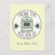 Eine Postkarte für Rezepte, die eine Abbildung eines dunkelweißen Hintergrunds und eines weißen Kreises in der Mitte enthält. Illustration eines Retro-grünen Ofens mit einem Herz auf jeder Seite und Text oben und unten, der "From the Kitchen Of" im inneren Kreis lautet. Personalisieren Sie Ihren Namen ganz unten. Auf der gegenüberliegenden Seite befindet sich ein weißes Rechteck mit grau geschliffenen Kanten und alten Foto-Ecken rechts. Text im Rechteck lautet "Rezept". Suchen Sie nach passenden Artikeln in Jill's Paperie.
