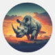 Ein majestätisches Nashorn steht hoch gegen einen pulsierenden Sonnenuntergang, dessen Form aus komplexen geometrischen Formen besteht. Die afrikanische Savanne streckt sich dahinter aus, mit Akazienbäumen übersät.