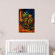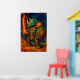 A powerful rhino warrior stands ready for battle, holding a flaming sword and golden shield. This fantasy wall art blends strength and courage with vivid orange-blue colors, perfect for fans of mythical heroes and epic adventure decor.