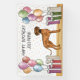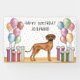 Desteis originelle Cartoon-Illustration einer niedlichen Rhodesier Ridgeback Rasse Hund. Der Hund wird in einer bunten Geburtstagslandschaft mit pastellfarbenen Geburtstagsballons und Geschenken platziert. Die Pastellfarben Rosa, Grün, Blau, Rot, Orange und lila. Der Hund ist auf einer gelben Holzfußboden-Textur stehend und der Hintergrund hat ein spielerisches pastellfarbenes Polka-Punktmuster. Es gibt auch einen personalisierbaren Textbereich.