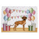 Desteis originelle Cartoon-Illustration einer niedlichen Rhodesier Ridgeback Rasse Hund. Der Hund wird in einer bunten Geburtstagslandschaft mit pastellfarbenen Geburtstagsballons, Geschenken und einem bunten Banner platziert. Die Pastellfarben Rosa, Grün, Blau, Rot, Orange und lila. Der Hund ist auf einer gelben Holzfußboden-Textur stehend und der Hintergrund hat ein spielerisches pastellfarbenes Polka-Punktmuster.