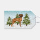 Desteis originelle Cartoon-Illustration einer niedlichen Rhodesier Ridgeback Rasse Hund. Der Hund ist in einer Winterlandschaft mit drei grünen Tannenbäumen und fallendem Schnee untergebracht. Der Hintergrund ist ein blaues bis weißes Gefälle, das das Design des kalten Wintertages verleiht. Auf der anderen Seite gibt es auch einen personalisierbaren Textbereich, der nun lautet: "Frohe Weihnachten!". Eine andere Textvorlage enthält die Wörter "TO:" und "AUS:".