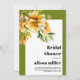 This fall bridal shower invitation showcases a rhododenron branch on the upper left corner of a white frame adorned with delicate orange yellow flowers and bordered by an olive green color. The text on the invitation is presented in a bold typography, making it stand out and easy to read. The olive green borders that frame the invitation on three sides complement the floral theme perfectly, creating a cohesive and visually appealing look for the event.