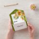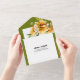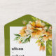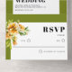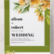 This invitation for a fall wedding showcases a delicate white frame, adorned with a branch of rhododenron with orange yellow flowers. These beautiful blooms are elega olive green borders complement the overall aesthetic, adding a touch of natural elegance. The minimalist yet bold typography of the text brings a modern and stylish element to the invitation, making it a perfect choice for a contemporary autumn wedding celebration.