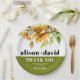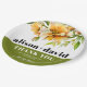 Rhododendron orange yellow flowers typography fall wedding Paper Plate. This elegant wedding paper plate showcases a beautiful rhododendron branch adorned with delicate orange yellow flowers and greenery at the upper part. The couple's names are prominently displayed in bold typography, adding a personal touch to the design. A heartfelt message of 'Thank You' is also included, expressing gratitude to the guests. Completing the look, a stylish olive green band gracefully adorns the bottom of the napkin, adding a touch of sophistication to any wedding celebration.