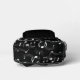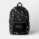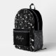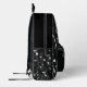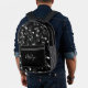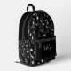 Rhythmus in Motion - Musical Instrument Muster Backpack Ein schlanker schwarzer Rucksack wird lebendig mit einem dynamischen weißen Muster von musikalischen Noten, gefeiert den Geist von Klang und Kreativität. Das Design vereint Praxisnähe und künstlerischen Flair mit einer Reißverschlusstasche und einem Mesh-Seitenfach - perfekt für alle, die Musik von überall her tragen.