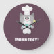Niedlicher Koch mit dem Wort "Perfekt!" über eine Aubergine lila Hintergrundfarbe.