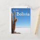 Postkarte eines Riesenkaktuses auf den weißen Salinen des Salar de Uyuni in Bolivien mit dem Text: "Liebe aus Bolivien".