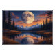 Ein Riesenmond dominiert den Nachthimmel, beleuchtet schneebedeckte Berge und reflektiert auf einem ruhigen See. Große Bäume umrahmen die Ufer, orange und blaue Wolken malen den Horizont. Sterne blinken herum und schaffen eine magische Szene, die Frieden und Staunen vermittelt. Dieses Kunstwerk vereint himmlische Schönheit und irdische Stille in einem Single. Es ist perfekt, um Träume und Verbindungen mit der Natur zu wecken.