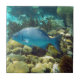 Schwimmend über weichen Korallen, heben die Skalen eines blauen Rifffisches einige Schimmer der Sonne, da die hellen Filter unten über von der Oberfläche des Wassers auf, während andere kleinere Fische im Hintergrund schwimmen.