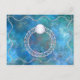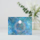 Ein verzierter, stilisierter silberner filigraner Ring mit bewölkten Perlen und Set mit einem Single runden weißen Edelstein mit einem Stern Blick aus seinen Tiefen, Set vor einem Hintergrund von wasserblauen Fraktalen.