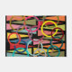 Dieses Türmchen hat ein modernes Design von Dreiecken und Ringen in Retrofarben auf einem schwarzen Feld.