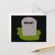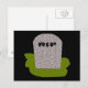 Diese sprichwörtliche Postkarte enthält einen grauen Grabstein mit RIP in tropfendem Text, stehend auf einem grünen Grasflächen. Der Hintergrund ist schwarz, passend zu diesem morbiden Design.