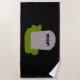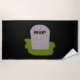Dieses phantastische Strandtuch ist mit einem grauen Grabstein mit RIP in schwarzem Text stehend auf einem grünen Grasflächen. Der Hintergrund ist schwarz, passend zu diesem morbiden Design.
