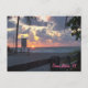 Ein Foto der Sonne, genau wie sie aus dem Atlantischen Ozean aufsteigt und dem Himmel ein rosa und orangefarbenes Licht verleiht. Jenseits eines Holzzauns und einer Palme sehen Sie Wellen, die an der Küste von Dania Beach, Florida, abstürzen. Der Name des Ortes ist in rosa, Script-Schriftart in der unteren rechten Ecke der Postkarte zu finden.