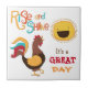 Hier ist eine lustige und farbenfrohe Küchenfliese mit einem farbenfrohen Crowing Roster und einer hellgelben, lächelnden Sonne. Stilisierter Text über dem Hahn sagt "Rise and Shine", und unter der Sonne "Es ist ein großer Tag". Die Farben sind braun, goldfarben und aquamarin blau. Niedlich! *Clip Art, die in diesem Design verwendet wird, ist urheberrechtlich geschützt durch Encore Software, Inc., die die Nutzung für ihre Lizenzgeber erlaubt. Alle Rechte vorbehalten.