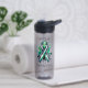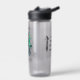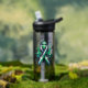 Water bottle to help spread awareness for Bipolar Disorder with a black, white and green striped awareness ribbon. An inspirational quote with the words, "Rising through the highs and lows."