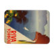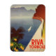 Reiseplakat mit Vogelblick auf ein Boot am Gardasee, mit einem bunten Zitronenbaum und Bergen in der Ferne.