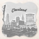 Ikonische Skyline-Sicht auf Cleveland, Ohio vom Fluss, auf der stilvollen schwarz-weißen Getränkeküste. Einzigartige Art, eine einzigartige Stadt zu zeigen!
