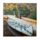 Dieses Foto kennzeichnet die großen Kanus, die rabaska genannt werden, die an einem sich hin- und herbewegenden Dock auf dem Ufer des Jacques-Cartier Flusses, Nationalpark Jacques Cartier festgemacht werden (Stoneham-und-Tewkesbury, Capitale-Nationale, Quebec, Kanada).