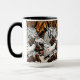 Start your day with the fierce power of a white tiger gripping bronze gongs, sunburst lines exploding outward. Floating debris and pink floral accents balance chaos with beauty in a bold, action-packed design.
