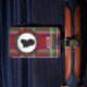 Ein völlig moderner Robert Burns in Silhouette präsentiert sich mit dem berühmten Bard in profile mit Spitzen-Shirt und Ponytail-Set auf künstlerisch gerendertem Tartan-Hintergrund mit der berühmten Linie von Burns Gedicht, Scotch Drink "O whiskey Soul o’ play and pranks!". Dieses komplett anpassbare Gepäckanhänger ist perfekt für jeden reisenden Burns Liebhaber.
