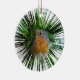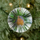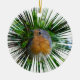 Ein digital erweitertes Foto eines Rotkehlchens, das auf einem runden Weihnachtsbaumschmuck gedruckt wurde.