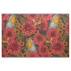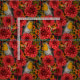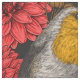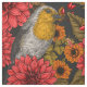 Robinen im Herbstgarten, rote Dahlien auf schwarz Stoff