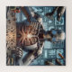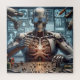 A humanoid robot is seated at a workbench surrounded by tools and intricate components. The setting is futuristic with digital screens in the background.