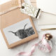 Rechteckiger Aufkleber mit einer robusten, aber lustigen schottischen Higland-Kuh mit großen Hörnern, langen Haaren vor den Augen und der Mund halb offen in schwarz-weiß / monochrom.