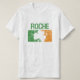 Ein T - Shirt, der ein beunruhigtes irisches weißes, grünes und orange Kleeblatt mit dem Familiennamen Roche kennzeichnet.
