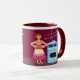 Eine lustige und freche sarkastische Retro illustrierte Rock and Roll Casserole schnauzigen Slogan kitschige Hausfrau Cartoon Charakter fünfziger Jahre Stil Schnellimbiskaffee, Tee oder Kakao-Keramik Tasse. Holen Sie sich heute eine lustige Kätzchen-Hausfrau heiße Getränke-Tasse.