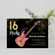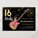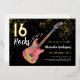 Für das Mädchen, das Lieben zu Rock, coole Rockgitarre Musik Thema 16. Geburtstag Party moderne Einladung. Rock and Roll bunt E-Gitarre mit goldenem Glitzer und musikalischen Notenabbildungen mit personalisierter moderner Kalligraphie Typografie auf schwarzem Hintergrund. Dieses leicht zu bedienende Template schafft die perfekte personalisierte Einladung, sechzehn im Rockstar-Stil zu feiern. Ideal, wenn Sie eine Liveband haben oder Gitarrist, Musiker und Musiker sind. Originelle Musikinstrumente von Künstlerin Catherine Sweetman