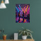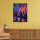 Dieses Gemälde fängt eine Rock-and-Roll-Band darstellend live auf einer hellen Bühne ein. Das Kunstwerk zeichnet sich durch seine schwere Impasto-Textur aus, mit dicken, ausdrucksstarken Pinselstrichen, die die energetische und dynamische Atmosphäre eines Konzertes vermitteln. Im Vordergrund stehen zwei Gitarristen, während im Hintergrund ein Bassist und ein Drummer unter lebendigen blauen, lila und gelben Scheinwerfern zu sehen sind. Die ganze Szene ist eine Feier der Musik und der Aufführung.