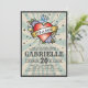 Hol deine Luftgitarre raus. Seien Sie bereit, mit unserer Einladung zu einem Baby-Duschbad "A Boy Rock and Roll Herz Tattoo". Genau richtig für eine Rock and Roll Babydusche. Mit einer klassischen und realistischen Tätowierung-Herd-Illustration mit dem Hintergrund eines Vintag blauen Sonnenlichts. Passen Sie den Text Ihren Wünschen an. Karo unsere Kollektion für passende Artikel. Rock auf!