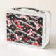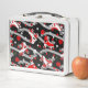 Rockabilly Retro Roller Skaten derby  Muster Lunchbox. Kirschen, Rose, Skate und Würfel auf grauem Band und zartem Polka-Punkt-Hintergrund.