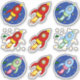Illustrationen einer niedlichen Rakete in Rot, Blues und Rosa, im Weltraum, umgeben von Sternen und einem kleinen grünen UFO-Raumschiff. Ideal für Kinder oder unterhaltsame Erwachsene. Benutzen Sie es als Party-Etiketten, oder für Ihr Bullet Journal, Notebook oder Scrapbooking, wenn Sie ein Schreibwarenliebhaber sind! www.floatinglemonsart.com www.marianablack.com Copyright © 2020 Mariana Musa for Floating Lemons. Alle Rechte vorbehalten.