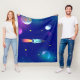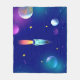 Rocket Fleece Blanket steigt durch den Weltraum und die Erde ist jetzt in der Ferne. Die Farbtöne sind blau, orange und lila.