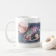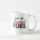 Feder mit Watercolorraketen-Schiffsillustration auf einer Kaffee-Tasse. Eine Seite hat die Illustration, während die andere "Rocket-Brennstoff" sagt. Es gibt einen Bereich über dem "Rocket-Brennstoff" für Namenskundenbezogenheit, wenn Sie sie wollen.