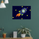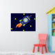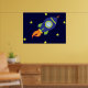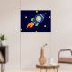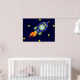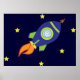 Ein lustiges Rocketschiff, das durch die Sterne fliegt. Blau, Grün, Orange, Rot, Gelb und lila.
