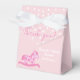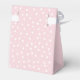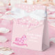 Ein niedlich rosa rosafarbenes Pferdeschlitten, das Gastgeschenk duscht. Vielen Dank für die elegante Schrift Typografie. Personalisieren Sie Name und Datum. Rosa Farbtöne für ein Babymädchen, das Party feiert. Großartiges Party für ein neues Baby. Rockpferde Gefälligkeitsbox mit weißen Sternen auf rosa Hintergrund.